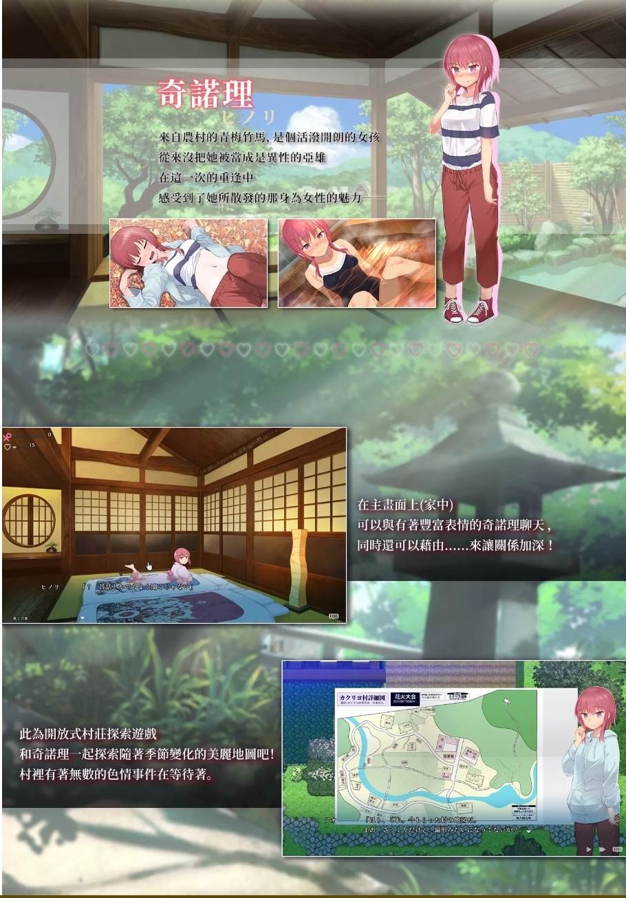 -基础CG80张以上,3种纯爱结局,2个坏结局,1个单身结局,超20小时时间。