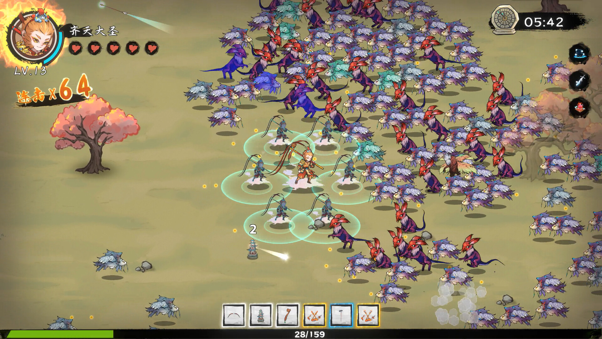 《西游志:山海战记》是一款水墨国风类幸存者割草游戏。玩家可以在战斗中进化自己的角色(比如小石猴-齐天大圣-斗战胜佛),使用奇妙无比的法宝,体验神出鬼没的七十二变,合成威力逆天的神器。然后在这个西游风味浓郁的世界中,体验令人上瘾的爽快战斗。